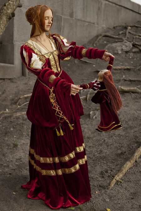 Ähnliche Kleider sind auf den Gemälden des berühmten Malers der Renaissance Lucas Cranach der Ältere zu finden. Die Gestalten auf den Gemälden „Judith“, „Salome", „Portrait der Herzoginnen Sybille, Emilla und Sidonia von Sachsen“, „Christus und die Ehebrecherin“, „Die heiligen Genoveva und Apollonia“ haben diese Gewänder an.