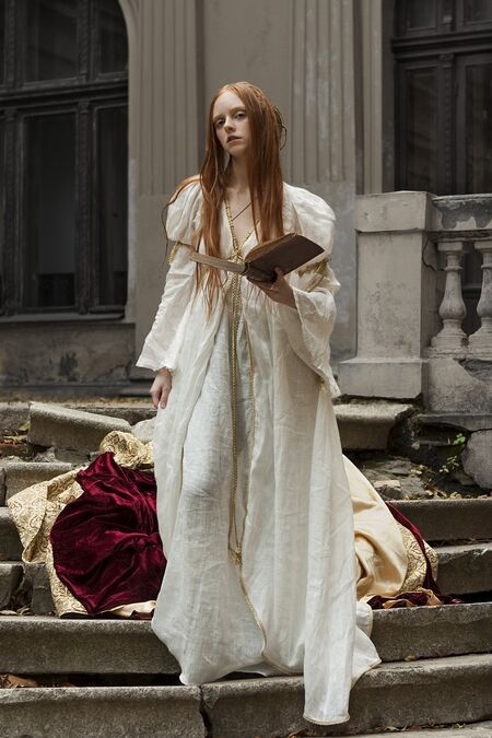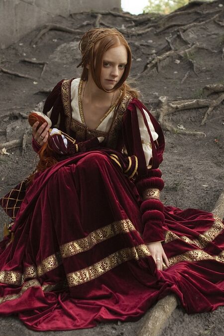 Die Anziehungskraft dieser Zeiten begeisterte uns, ein Renaissance Kleid und einen Renaissance Umhang im Geiste der Renaissance zu schaffen. Schwere Samtfalten (engl.Velvet), glänzender Brokatbesatz, gezwirnte Schnüre und Seidenquasten überzeugen fest, dass dieses Gewand für ein prachtvolles Palastleben vorbestimmt ist.
