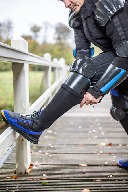 Für viele moderne HEMA-Fechter ist das Tragen von Schienbeinschonern in Socken die bequemste Lösung für den Unterschenkelschutz – und dafür ist die richtige Balance zwischen Dehnbarkeit und Komfort bei Kniestrümpfen entscheidend. Zwar gibt es eine große Auswahl an kniehohen Sportsocken, doch die meisten sind als Kompressionsstrümpfe konzipiert und bieten kaum Platz für die Polsterung, die historische Fechter beim Training oder Sparring benötigen.