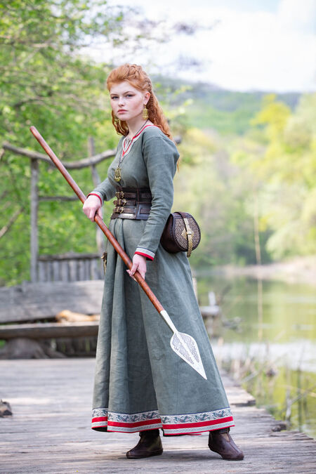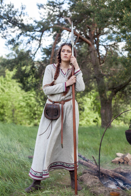 Allerdings haben wir es versucht, die Schönheit der weiblichen Figur zu betonen, so viel wie die Wikinger Kleidung das ermöglicht - mit seinem freien und schwimmenden Schnitt. Recht geräumig im Bizeps und an Handgelenk verengt, ist es deshalb möglich, die Ärmel in allen täglichen Aufgaben beschäftigt zu machen. Ein weiter Rock erreicht die Knöchel, deshalb begrenzt den Schritt nicht, und betont eine feminine Silhouette.