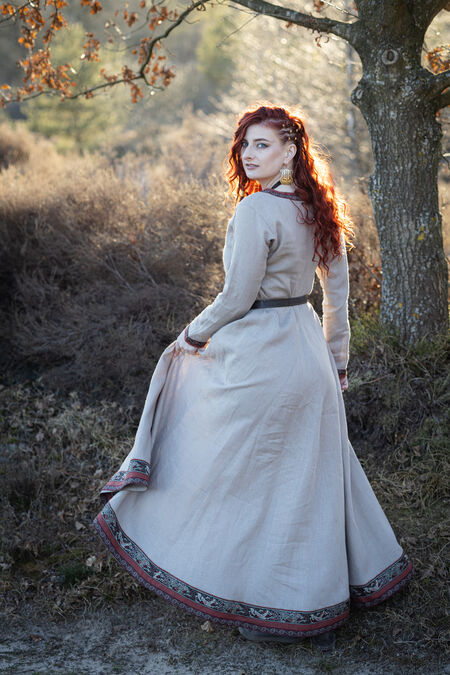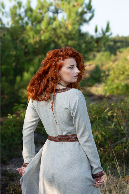 Traditionelle T-Form Leinentunika mit Kontrastnaht, exklusive Borte und mit einer gefärbten Jutefaser verziert. Die Silhouetten der antiken Verkleidung der normannischen Krieger war sehr ähnlich mit der Damen-Verkleidung jener Zeiten.