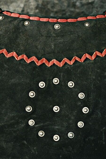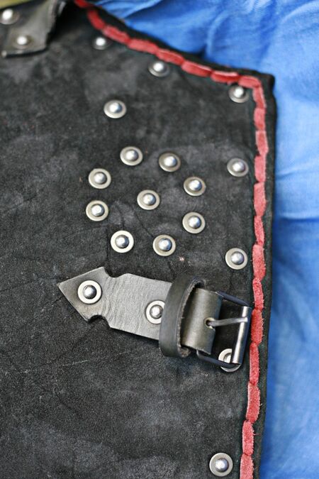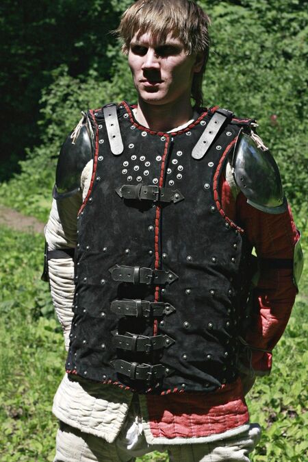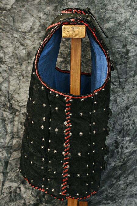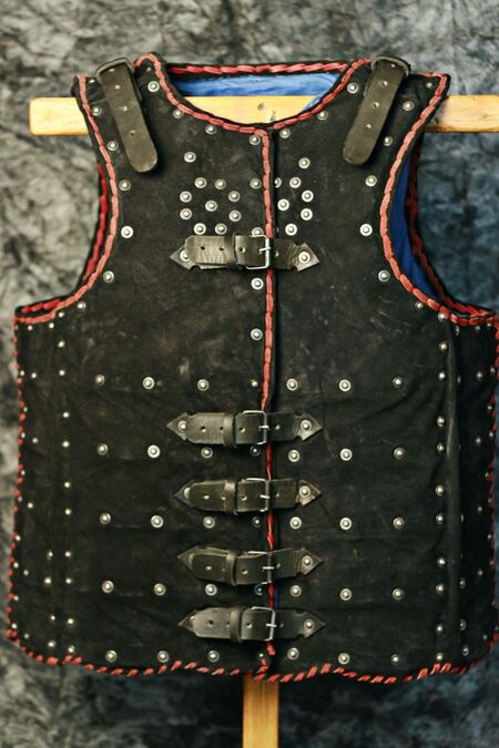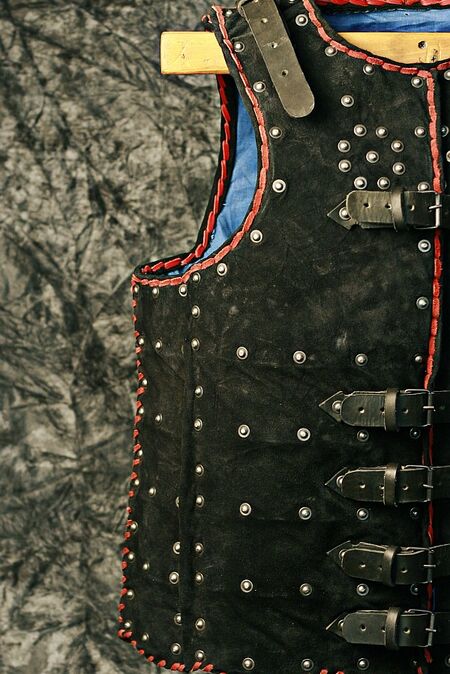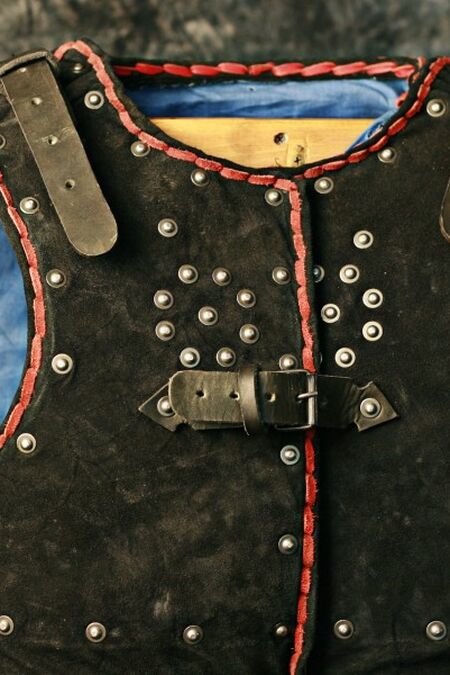 Dieser Schuppenpanzer, Brigantine wird aus 3 Stoffschichten gefertigt: Außen ist eine Lederschicht, darunter eine Schicht aus Baumwolle und eine Schicht aus Leinen. Innen befinden sich Mettalplatten aus 1 mm kaltgewalztem Stahl (handgefertigt). Auf Ihre Anfrage auch mit 1,5 mm kaltgewalztem Stahl verfügbar. Die Kanten sind mit Lederbordüren verziert. Die Brigantine hat Metallnieten.