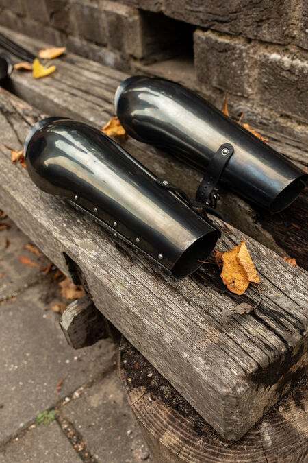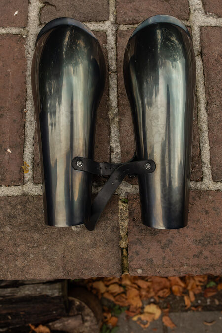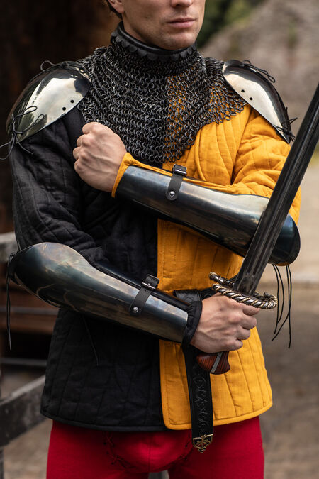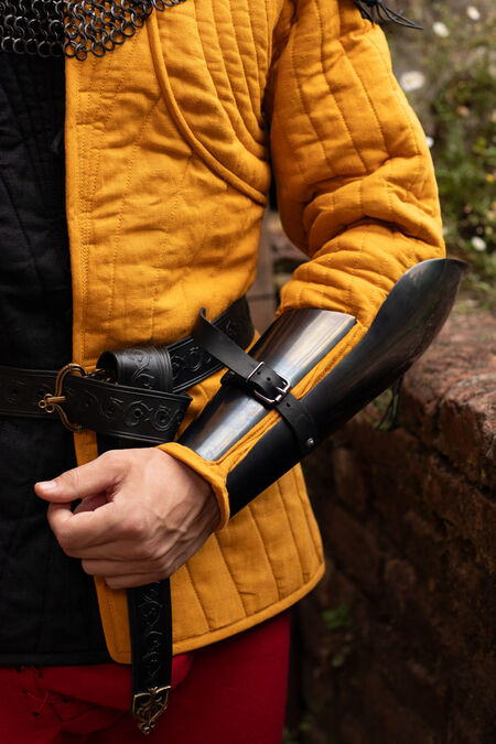 Lange Armschienen mit integrierten Ellbogenschützern, gehören sowohl in der Moderne als auch in der Vergangenheit zu den beliebtesten Stücken unter Schwertkämpfern. Bei spätmittelalterlichen weißen Rüstungen waren Komplexität, raffinierte Formen und die technische Ausführung entscheidend für die Entwicklung der bestmöglichen Rüstung. Bei einfacherer und praktischerer Ausrüstung sind jedoch Einfachheit und eine minimale Anzahl beweglicher Teile stets die Eckpfeiler für Funktionalität und Integrität. Einteilige Armschienen sind das absolute Minimum, daher sind einteilige Armschienen mit integriertem Ellbogenschutz eine bewährte Lösung.