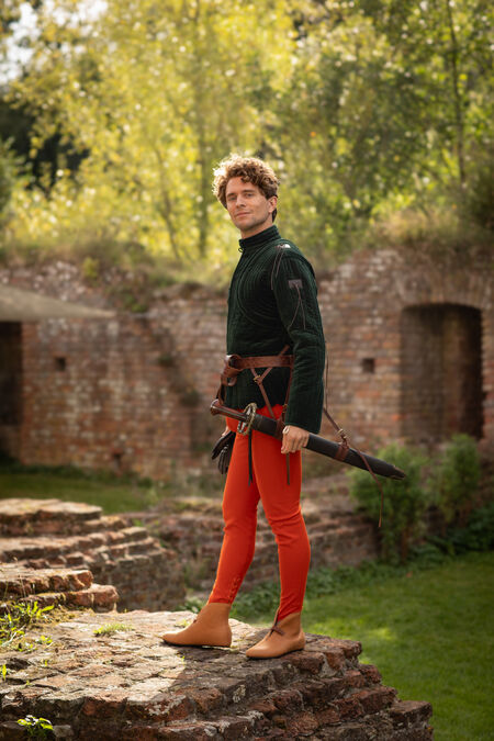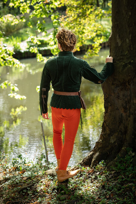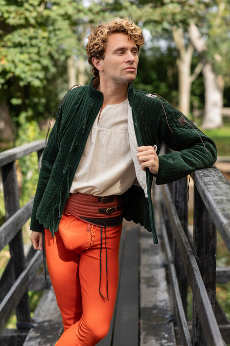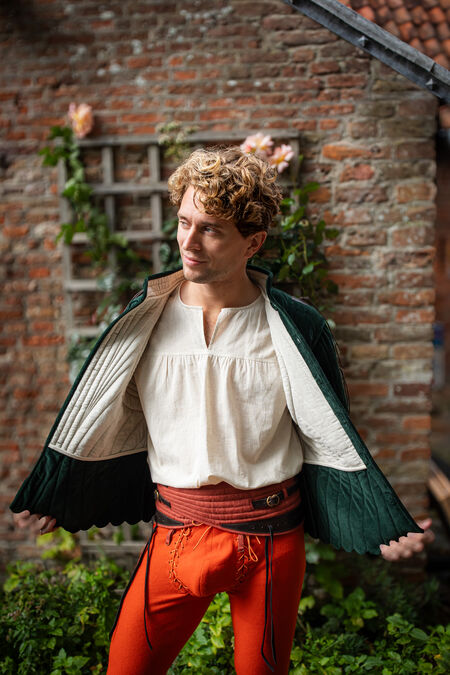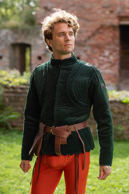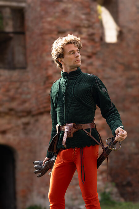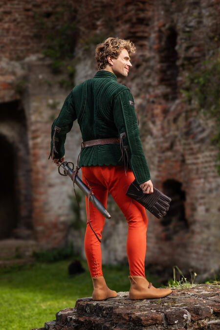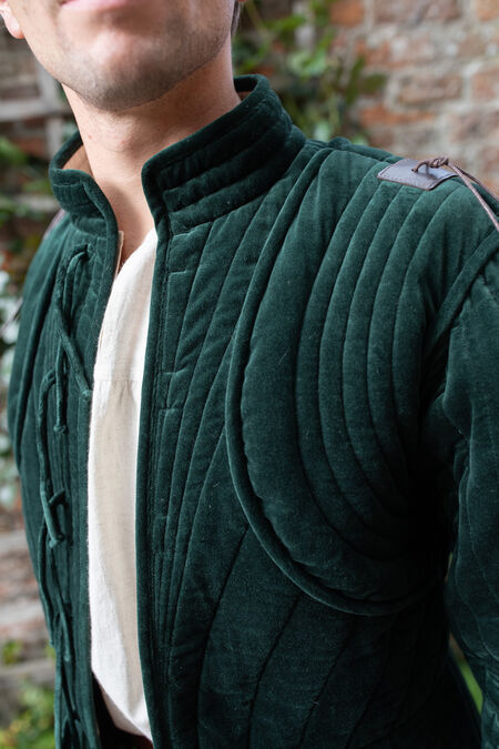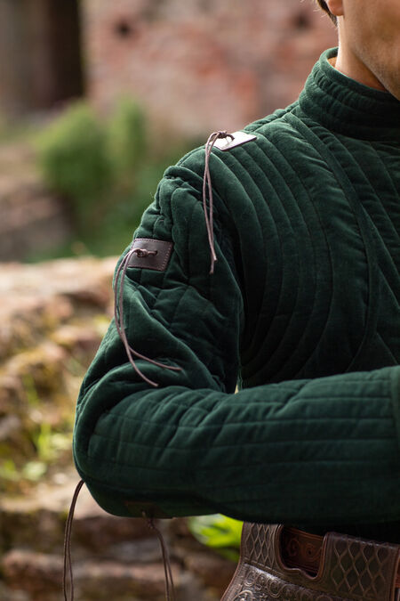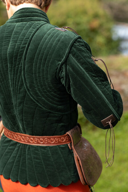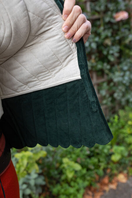 Der Gambeson verfügt über ein dünnes, aber robustes, naturfarbenes Futter aus einem Leinen-Baumwoll-Gemisch. Der zweireihige Ärmel, inspiriert von modernster Schneiderkunst, bietet außergewöhnliche Bewegungsfreiheit für den Arm und bewahrt gleichzeitig den traditionellen Look des späten Mittelalters.