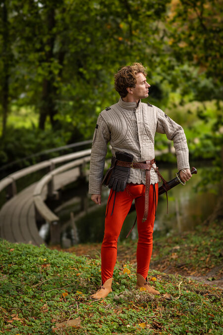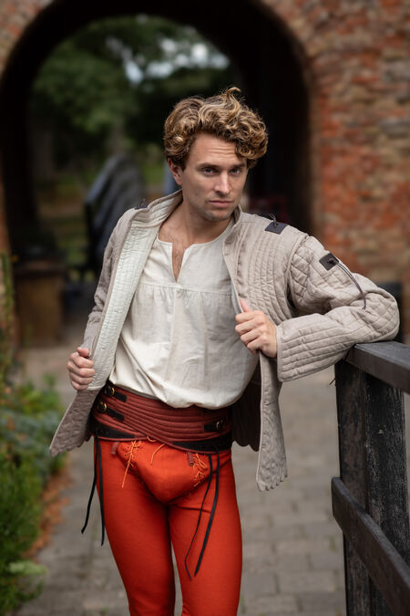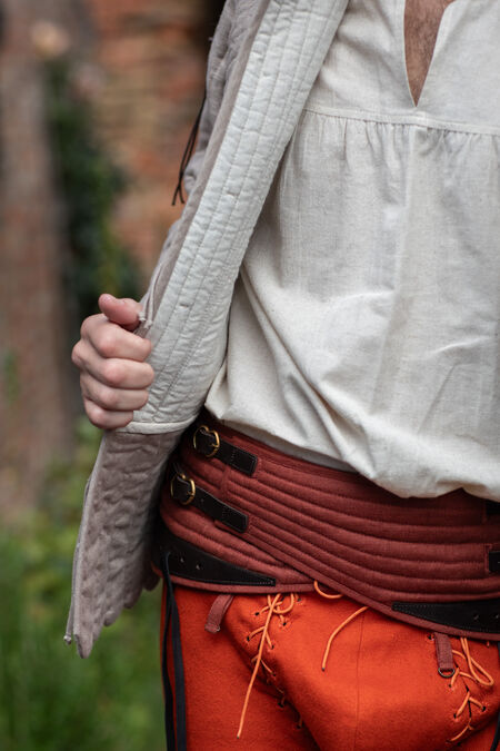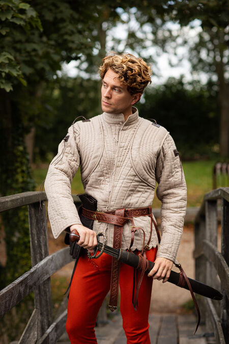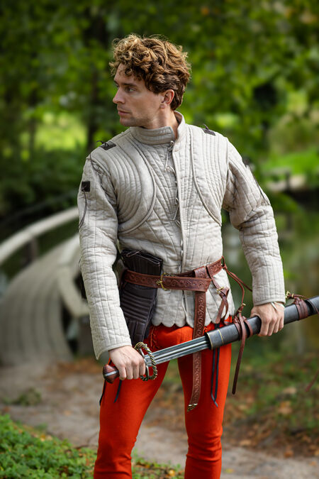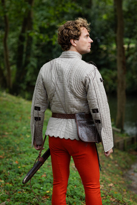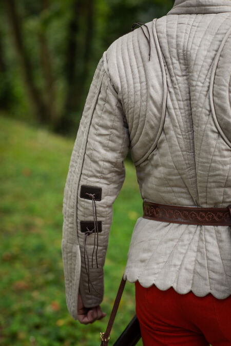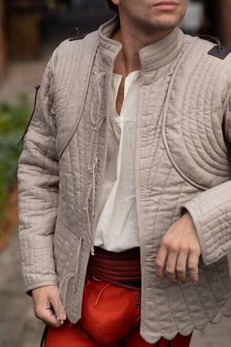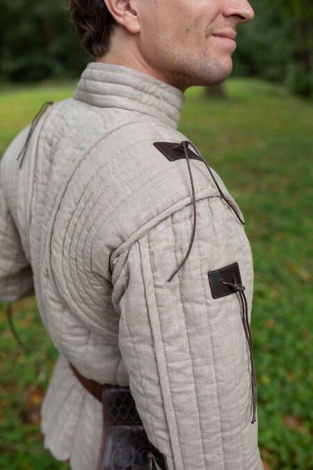 Der Gambeson wird überlappend mit sauberen Leinenbändern und -schlaufen geschlossen. Schulter- und Brustpasse sind mit einer zusätzlichen Lage Baumwollvlies verstärkt. Der gesteppte Stehkragen schützt den Hals vor dem Kontakt mit dem Halskragen. Ein langer Schlitz am Unterarm ermöglicht es, den Ärmel unter den Armschutz zu wickeln. Der Gambeson verfügt außerdem über robuste Lederpolster an Schultern und Ärmeln, die als Befestigungspunkte für die Armschienen dienen.