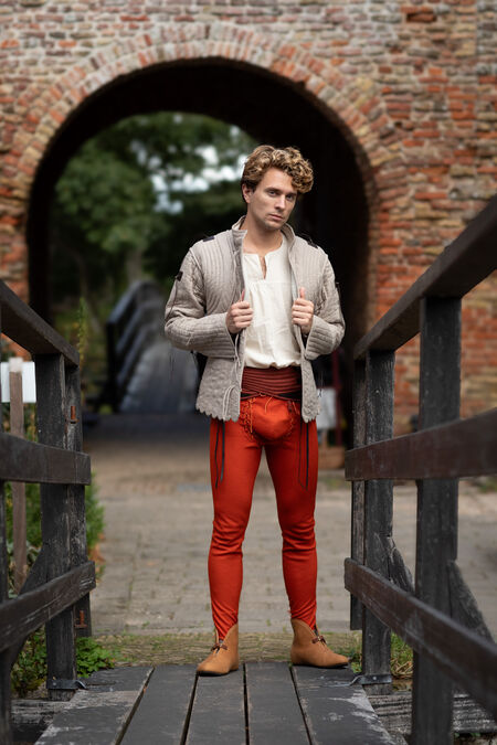 Wir haben ein neues Steppmuster in Form einer Sanduhr entworfen, das an die Steppung der „Jacques“-Gambesons aus der Zeit des Hundertjährigen Krieges erinnert. Die Stepplinien am Schößchen gehen in anmutige, halbkreisförmige Muschelkanten über – ein charakteristisches Merkmal der Kleidung des späten Mittelalters und der frühen Renaissance.