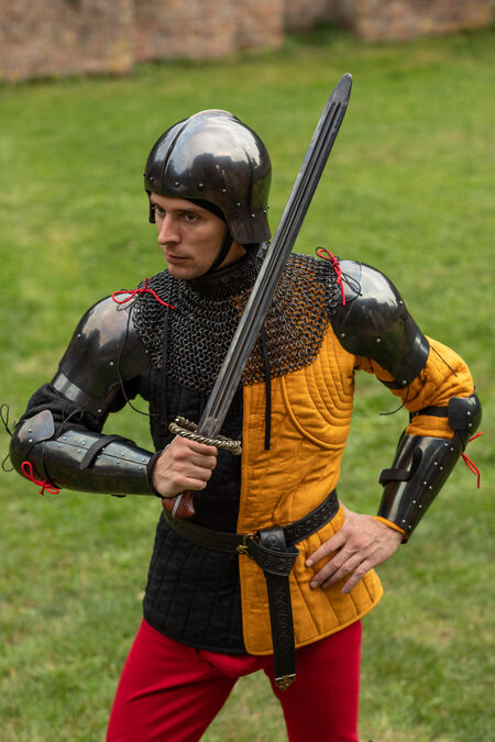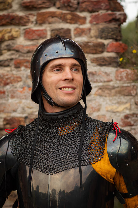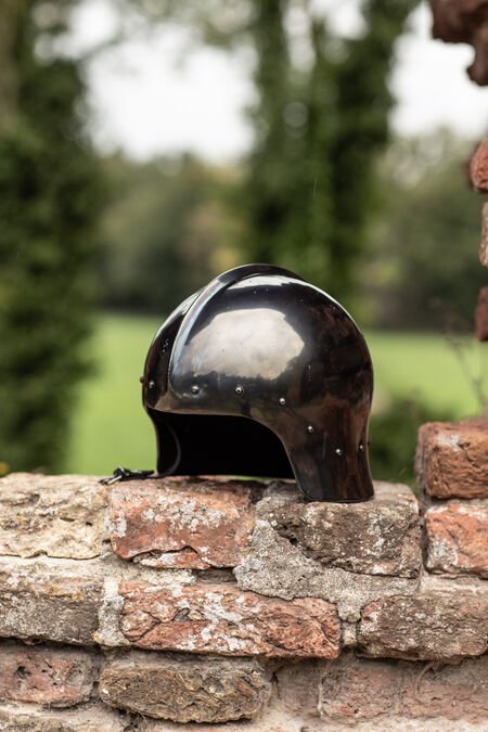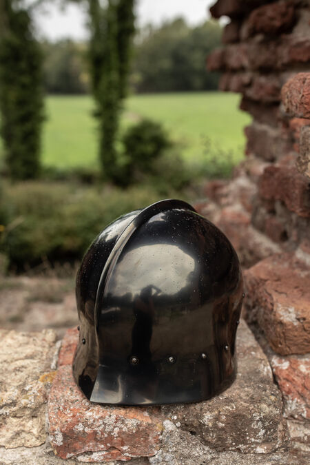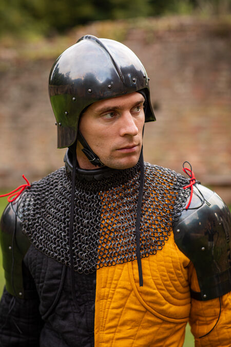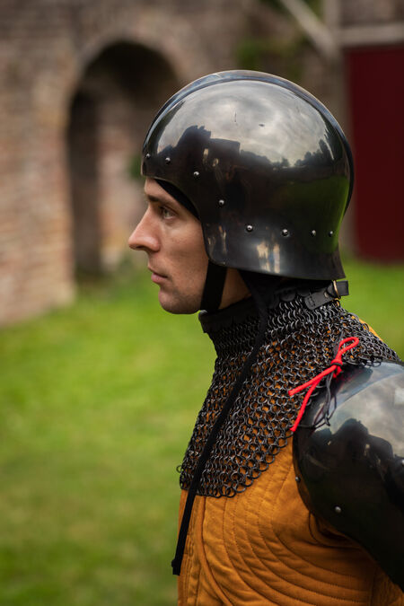 Wer in jeglicher Form in Rüstung kämpft, vom punktbasierten WMA-Schwertkampf über SCA und HEMA-Harnischfechten bis hin zu Buhurts, bezeichnet seine Rüstung immer als „echt“, während alles, was nur der Optik dient, als Kostümierung gilt. Interessant ist, dass Helme, insbesondere frühe und für die unteren Ränge gepanzerter Soldaten gefertigte, meist ein recht einfaches und dünnes Futter hatten. Dadurch ähnelte ein Helm eher einer Überlebensausrüstung gegen einen unglücklichen Treffer als einem Panzer, der wiederholter Beanspruchung in Turnieren und vielen, vielen harten Schlägen standhält. Betrachtet man die historischen Quellen, findet man daher immer Helme, die deutlich proportionaler sind als moderne Schwertkampfhelme mit massiver Polsterung.