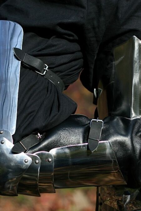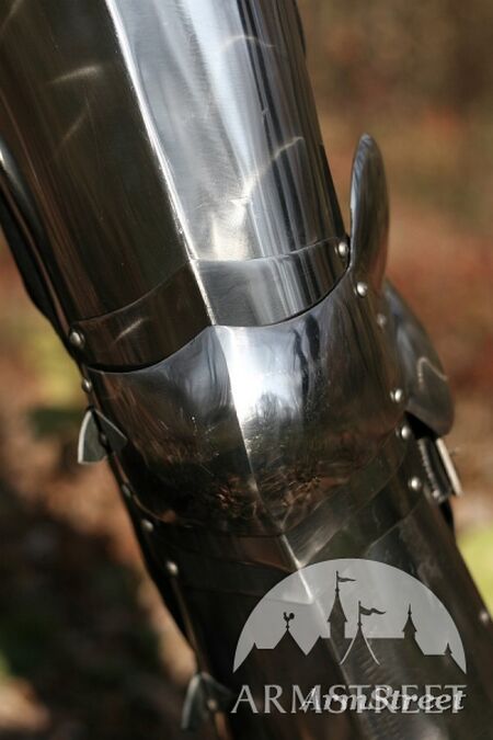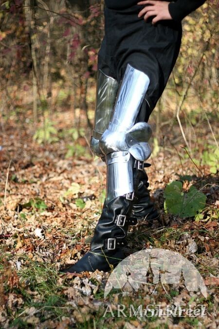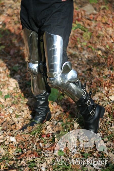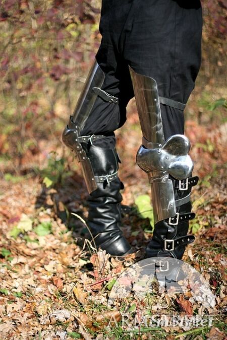Mittelalterlicher Beinzeug: Beinschiene mit Kniebuckel. Eine gute Wahl für sowohl mittelalterliche- als auch für Trainingskämpfe. Das klassische mittelalterliche Design ist einfach gehalten und in vielen Turnieren und bei mittelalterlichen Events getestet und erprobt.
