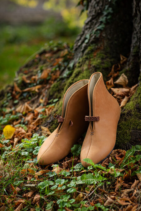Die Sohle ist aus Hartleder gefertigt und zusätzlich mit einer Gummiauflage versehen. Die Schuhe sind in Ahnlehnung an die damals verwendeten Original-Techniken gefertigt. Diese Fertigungsart gibt Ihren Füßen Schutz und Halt auf harten Oberflächen wie z.B. modernen Straßen, aber auch auf unebenem, steinigem Untergrund. Gleichzeitig entspricht die Optik der Schuhe perfekt dem historischen Vorbild.